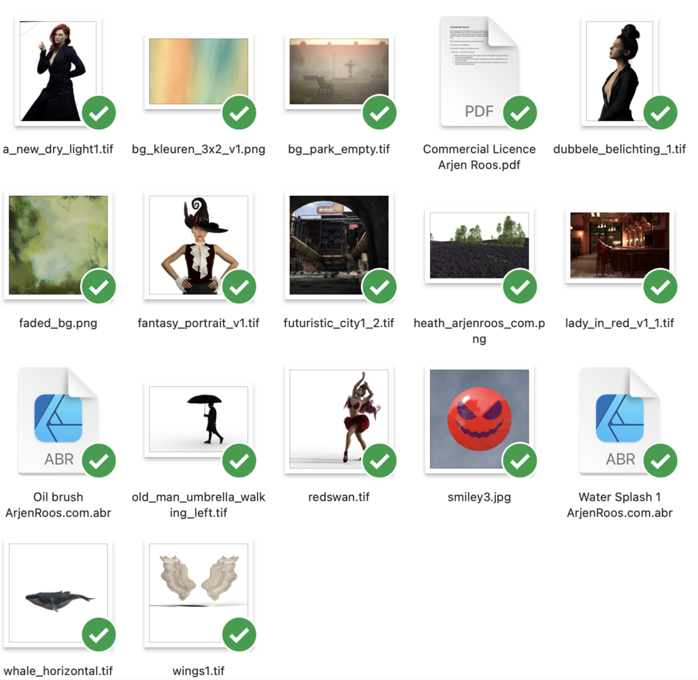 Images include a walking old man, magical portrait, a ballerina, background textures, park background, angel wings and more.